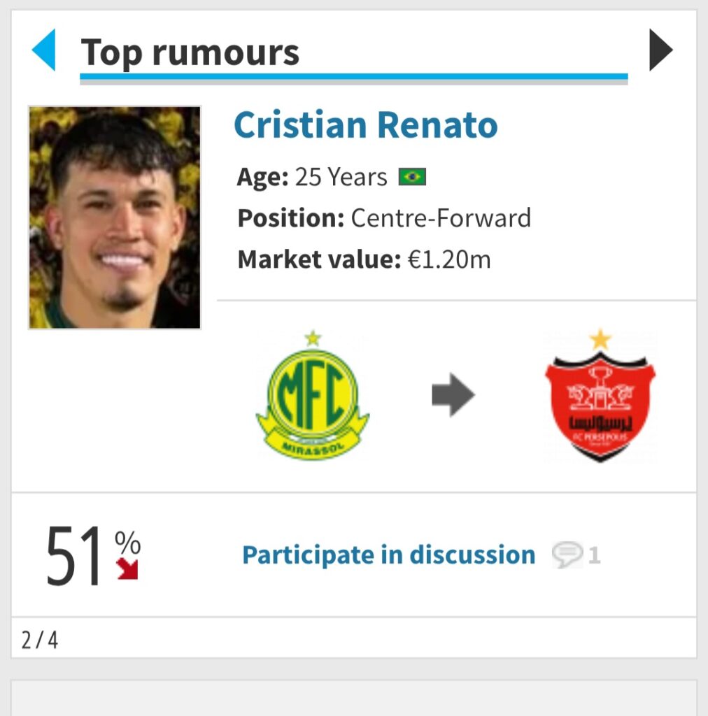 این سایت همچنان کریستیان رناتو برزیلی را مثل روزهای قبل در بین گزینههای پرسپولیس در خط حمله قرار داده است. این انتقال نیز در مسیر مثبتی از نظر این سایت پیش نمیرود و اکنون ۵۱ درصد شانس موفقیت دارد.