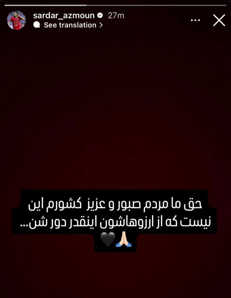 سردار آزمون، مهاجم تیم ملی ایران و باشگاه شبابالاهلی امارات، با انتشار یک استوری احساسی در اینستاگرام، پیامی خطاب به مردم ایران منتشر کرد.