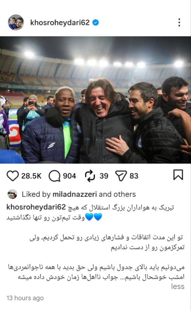 خسرو حیدری مربی تیم استقلال بعد از برد این تیم در بازی حساس برابر سپاهان با انتشار یک پست به حواشی پس از این دیدار واکنش نشان داد.