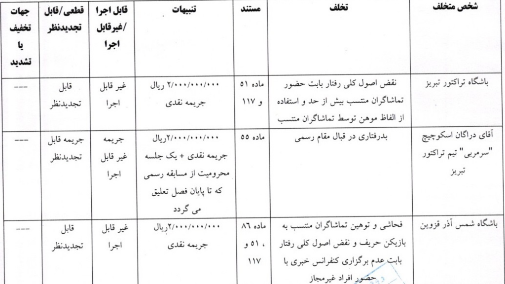 و اما احکام بازی تراکتور و شمس آذر قزوین؛ باشگاه تراکتور به دلیل حضور بیش از حد تماشاگران خود 200 میلیون تومان جریمه شده است. شمس آذر نیز به دلیل فحاشی و توهین تماشاگران خود به بازیکنان حریف با جریمه 200 میلیون تومانی مواجه شده است.
