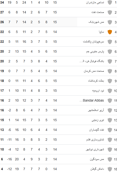 جدول لیگ آزادگان در پایان بازی های روز اول هفته پانزدهم