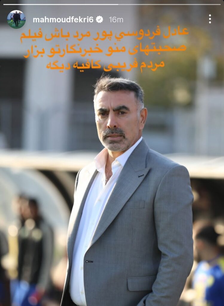 سرمربی نفت و گاز گچساران در این استوری خطاب به عادل فردوسیپور نوشت: «عادل فردوسیپور مرد باش، فیلم صحبتهای من و خبرنگارتو بذار. مردمفریبی کافیه دیگه.»