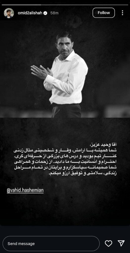 کاپیتان پرسپولیس در یک استوری اینستاگرامی از وحید هاشمیان تقدیر کرد.