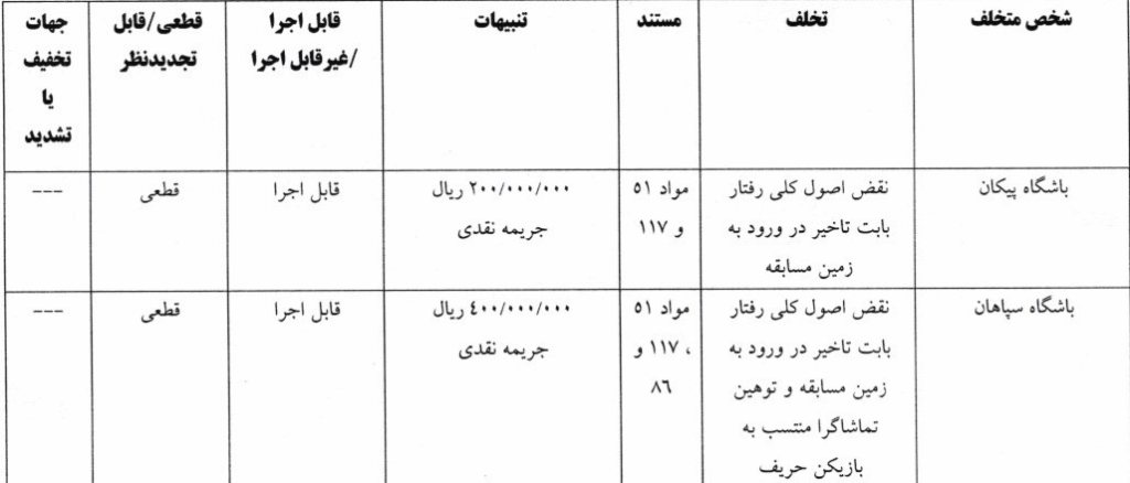 رای تخلفات باشگاه پیکان و سپاهان به شرح زیر است: