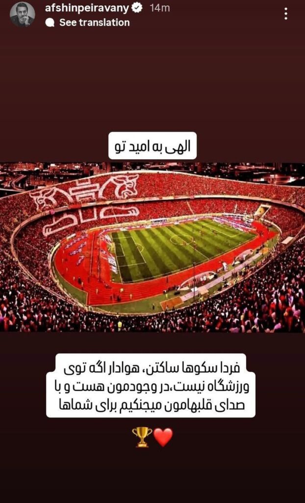 افشین پیروانی با انتشار استوریای احساسی، نسبت به غیبت هواداران در بازی فردای پرسپولیس و پیکان واکنش نشان داد.
