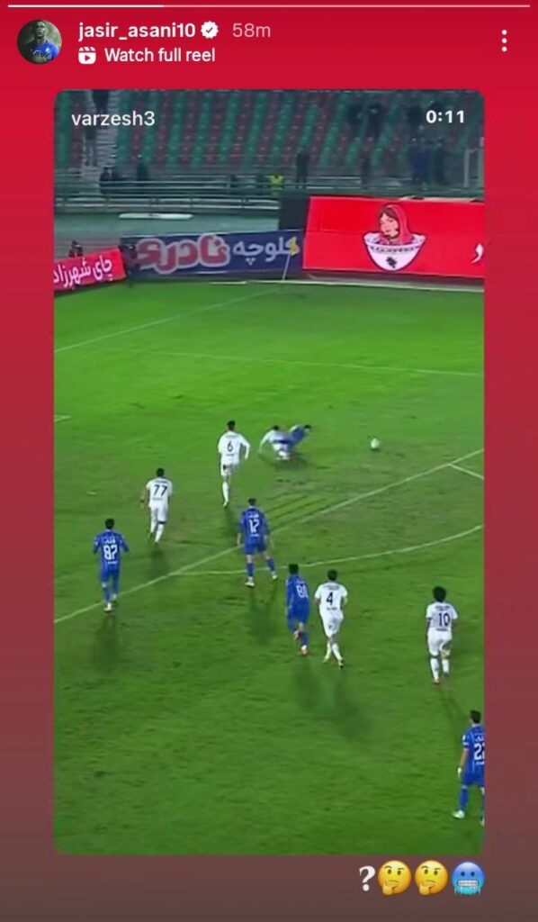 آسانی در استوری خود تصویری از همان صحنه منتشر کرد و تنها یک علامت سؤال بزرگ روی آن گذاشت؛ واکنشی که معنای اعتراض خاموش داشت و بهوضوح نشان میداد او نیز معتقد است داور باید اعلام پنالتی میکرد.