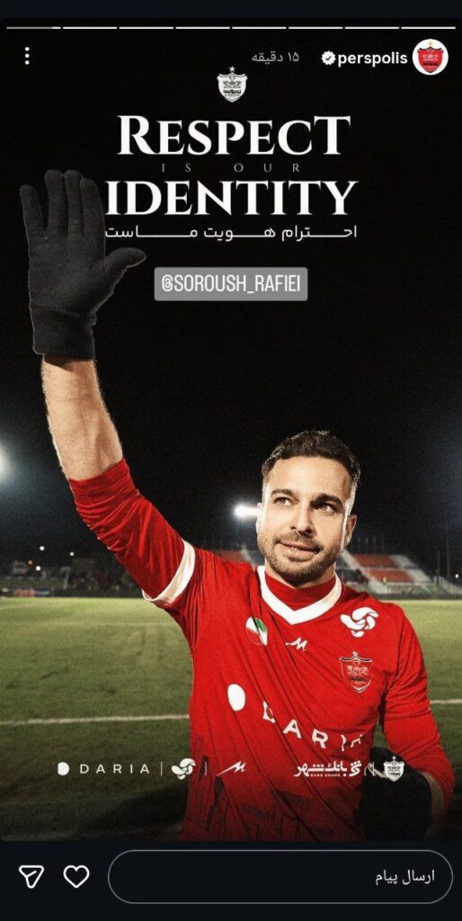 باشگاه پرسپولیس با انتشار تصویری از سروش رفیعی نوشت: «احترام هویت ماست» و به این شکل حمایت خود را از هافبک باتجربه تیمش اعلام کرد.