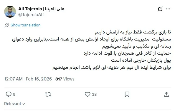 علی تاجرنیا می گوید تیم نیاز به آرامش دارد اما با توییتی که زد منجر به افزایش شایعات بیشتر در اطراف استقلال شد.