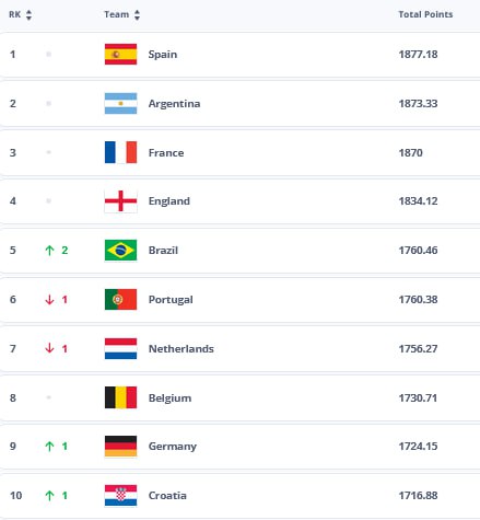 اسپانیا، آرژانتین، فرانسه، انگلیس، برزیل، پرتغال، هلند، بلژیک، آلمان و کرواسی