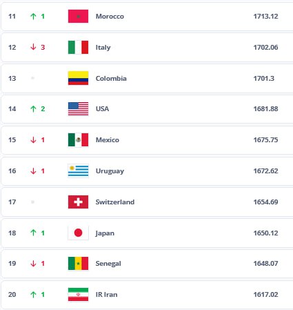 به لطف پیروزی اسکاتلند مقابل دانمارک در رقابت های انتخابی جام جهانی دانمارکی ها که در رتبه بیستم قرار داشتند یک پله سقوط کردند و ایران جای دانمارک را در رده بیستم گرفت.