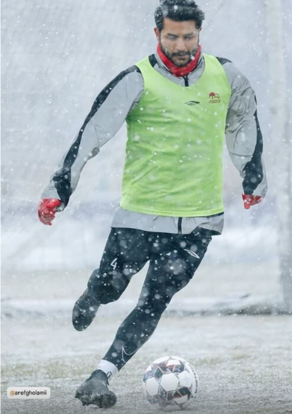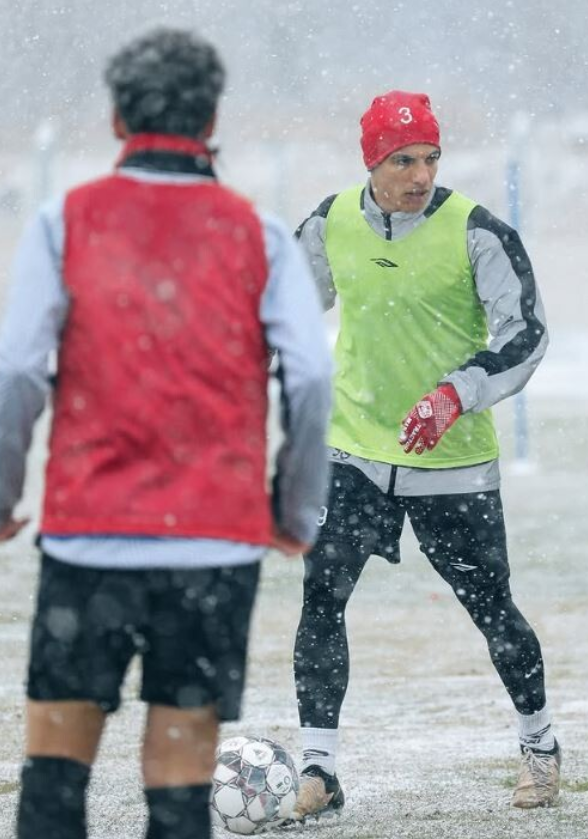 بازیکنان تیم تراکتور در هوای برفی و سرد، تمرینات خود را با جدیت ادامه میدهند. در یکی از تصاویر، امیرحسین حسینزاده در حال کنترل توپ دیده میشود، در حالی که زمین پوشیده از برف شرایط سختی را برای تمرین ایجاد کرده است.