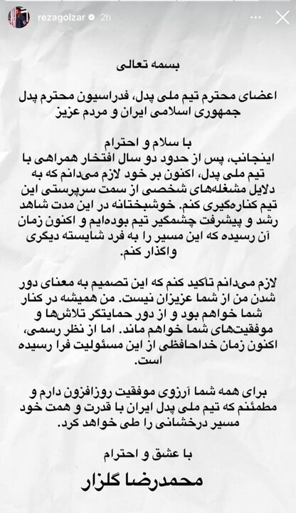 محمدرضا گلزار سرپرست تیم ملی پدل از سمت خود استعفا کرد.