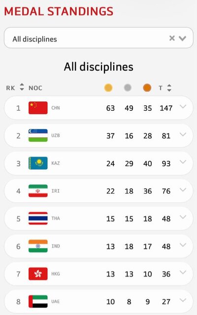 در پایان این مسابقات ایران با ۲۲ مدال طلا، با ۱۶ پله صعود نسبت به دوره قبل به رده چهارم جدول مدالی رسید و رکورد پیشین خود را پشت سر گذاشت.
