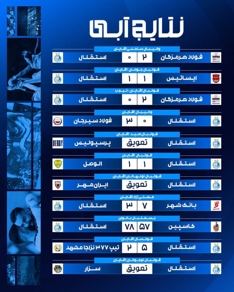 به گزارش هفت ورزشی، باشگاه استقلال، نتایج مسابقات تیمهای مختلف خود در هفته گذشته را اعلام کرد.