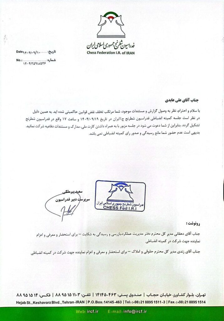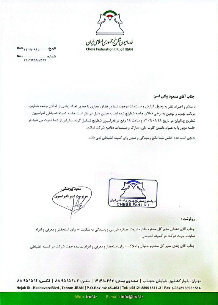 فدراسیون شطرنج با امضای دبیر غیرقانونی این فدراسیون که به دلیل حضور همزمان در سه منصب موازی (سرپرستی دبیری فدراسیون، ریاست هیات شطرنج خراسان و مدیریت یک باشگاه خصوصی) فعالیتش در کرسی دبیری خلاف اساسنامه است، برخی اهالی شطرنج را به اتهام تخلف حاکمیتی و … به جلسه کمیته انضباطی احضار کرده است.