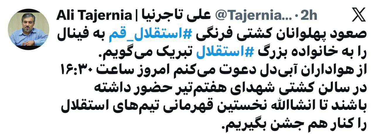 صعود پهلوانان کشتی فرنگی استقلال قم به فینال را به خانواده بزرگ استقلال تبریک میگویم. از هواداران آبیدل دعوت میکنم امروز ساعت ۱۶:۳۰ در سالن کشتی شهدای هفتم تیر حضور داشته باشند تا انشاالله نخستین قهرمانی تیمهای استقلال را کنار هم جشن بگیریم.