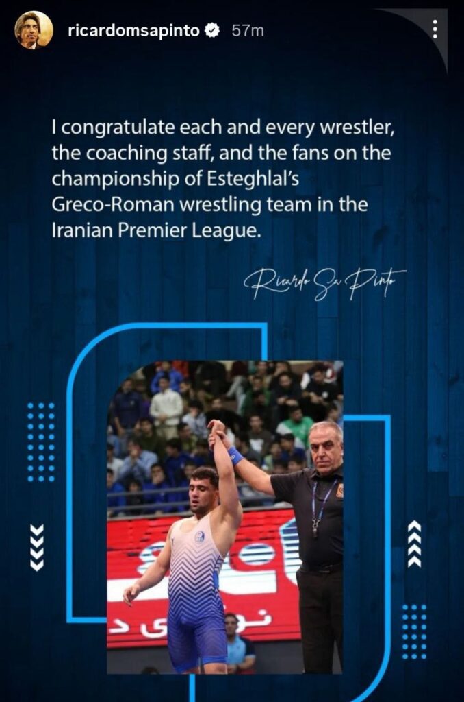 ریکاردو ساپینتو با تبریک قهرمانی تیم کشتی فرنگی استقلال، این موفقیت را افتخاری بزرگ برای خانواده آبیها دانست.